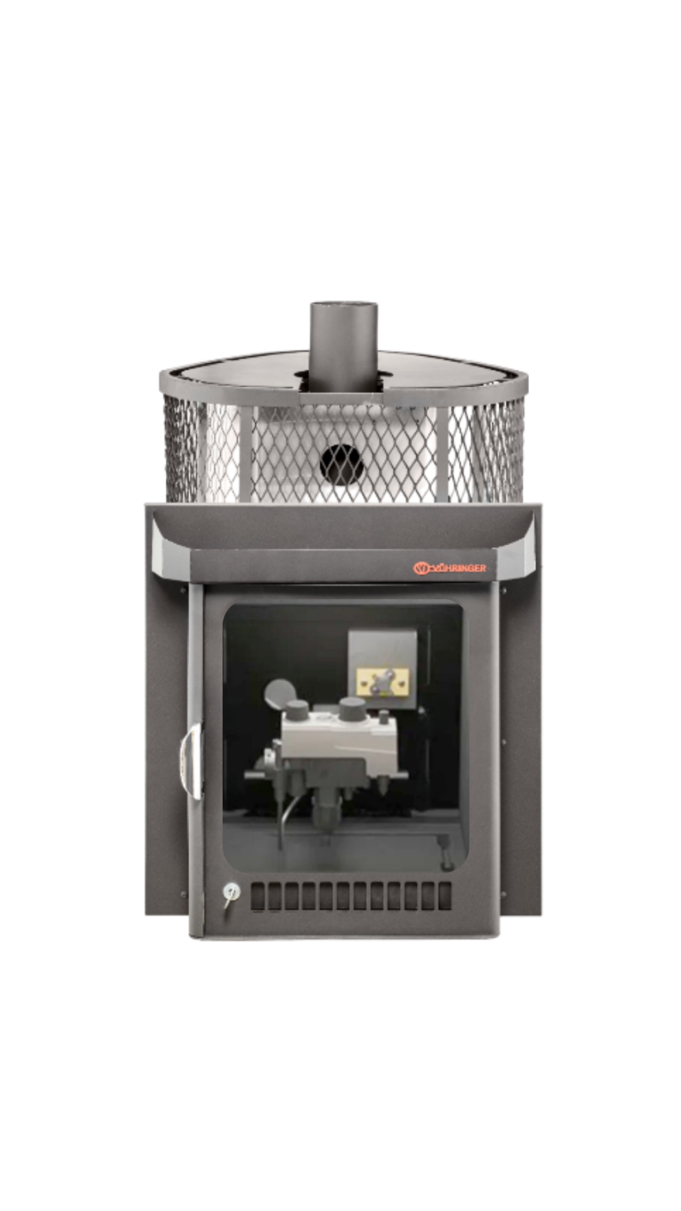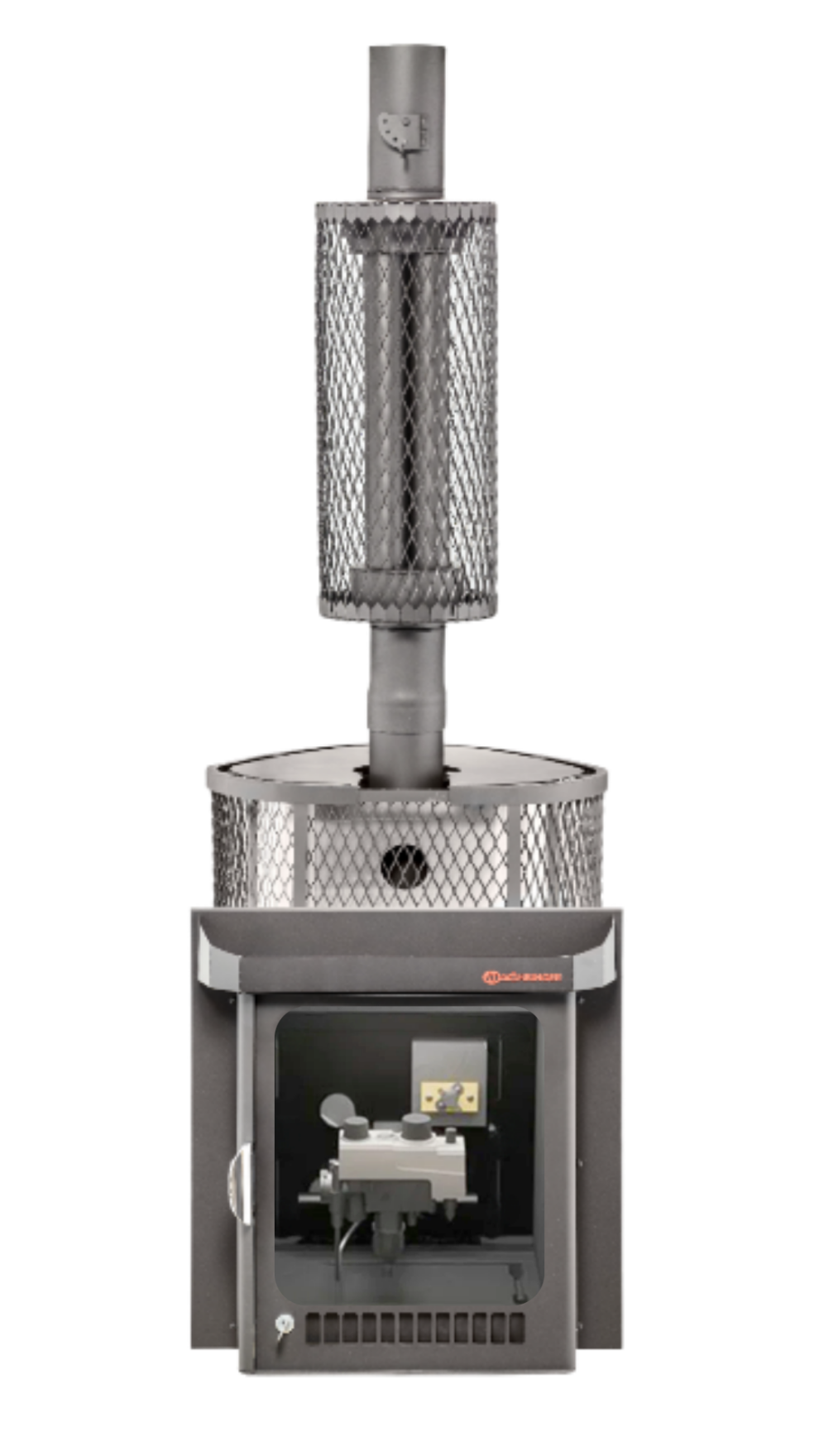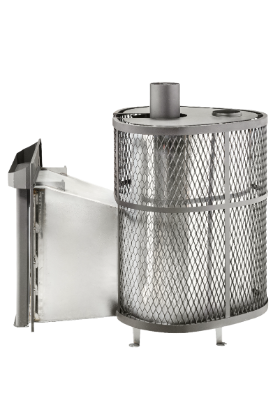 При этом внешняя каменка в сетке выполняет декоративную роль. Топка печи выполнена из жаростойкой нержавеющей стали AISI439. Растопка осуществляется из смежного помещения посредством газовой горелки, инструкция от производителя газовой горелки прилагается. Дверца снабжена большим стеклом. В "Оптиму ПФ" в сетке можно установить пароиспаритель Ферингера (ПИФ) и 3 парогенерирующие кассеты.