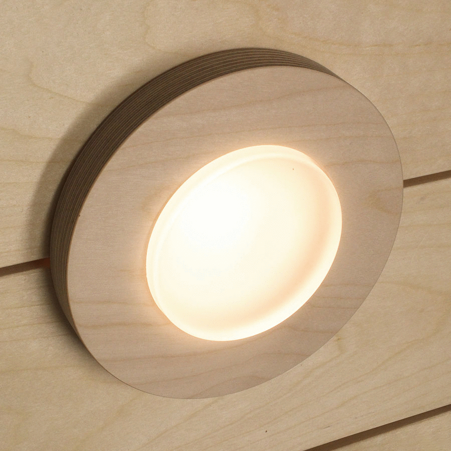 Круглый потолочный светильник для бани и сауны и ванной. Подключается к оптическому волокну или светодиодному кабелю. Изготовлен из матового стекла, алюминиевого отражателя и деревянной оправы. При желании, оправу можно обработать маслом для получения более темного тона.