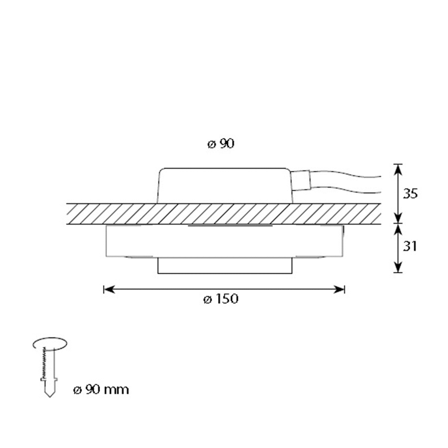 Габариты: внешний диаметр 150 мм, диаметр монтажного отверстия 90 мм, глубина встраивания 35 мм, выступает из потолка на 31 мм.